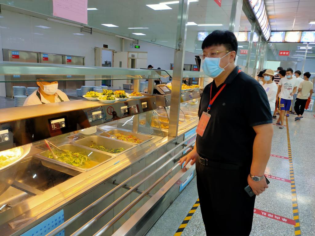 在餐厅,张传辉详细询问食堂疫情防控及饮食服务保障工作开展情况,检查了环境卫生、场所消毒、餐饮浪费和学生就餐情况,向坚守岗位、奋战一线的后勤食堂员工表示感谢和慰问。张传辉强调,食堂疫情防控是学校防疫工作的重要一环,要严格按照学校防疫工作要求,扎实有效开展好各项工作。要坚持错峰就餐,确保供餐时长,就餐排队时要严格做到不聚集、保持安全距离,确保每一个环节都可防可控。要继续维持食堂饭菜价格稳定,保障学生饮食的需求,全力为同学们提供安全、优质的餐饮服务。(文/摄:陈波)