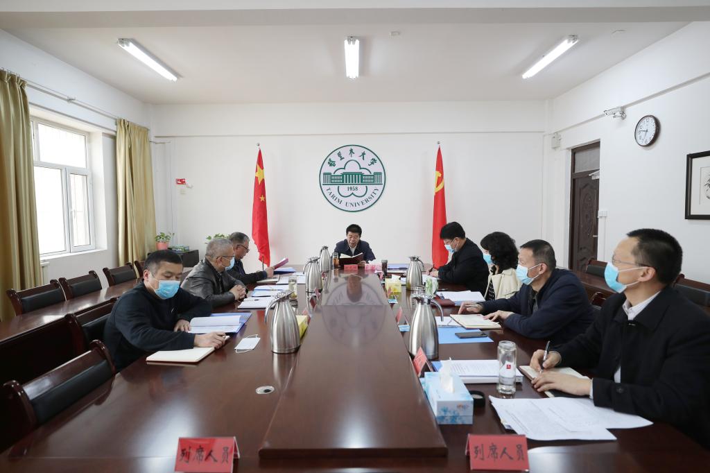 3月28日下午,学校党委召开常委会会议,传达学习中共中央政治局会议精神和习近平总书记在二十国集团领导人应对新冠肺炎特别峰会上发表的重要讲话精神,学习贯彻自治区党委常委(扩大)会议和兵团党委常委会会议精神,进一步研究部署统筹推进学校疫情防控、在线教学、事业发展和科技服务春耕春播、脱贫攻坚等工作。党委书记赵光辉主持会议。党委副书记、校长张传辉,党委副书记、纪委书记单洪山,党委副书记张爱萍,党委常委、副校长曲义勇、于军、石长青,党委常委、组织部部长马智群出席。