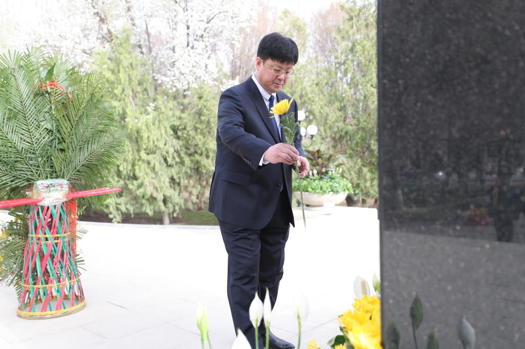 党委书记赵光辉拾阶而上,整理花篮缎带。