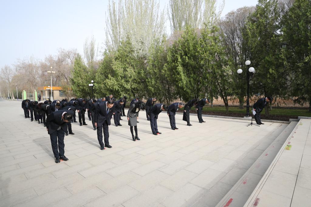 接着,参与仪式的领导干部,依次走向前将手中的鲜花摆放在铜像前,缓步绕行行瞻仰革命先烈的光辉形象。