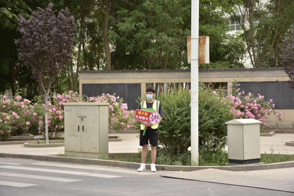 志愿者劝导同学们注意自身防护与交通安全,轮流执勤,提醒大家不扎堆,不聚集,戴好口罩。