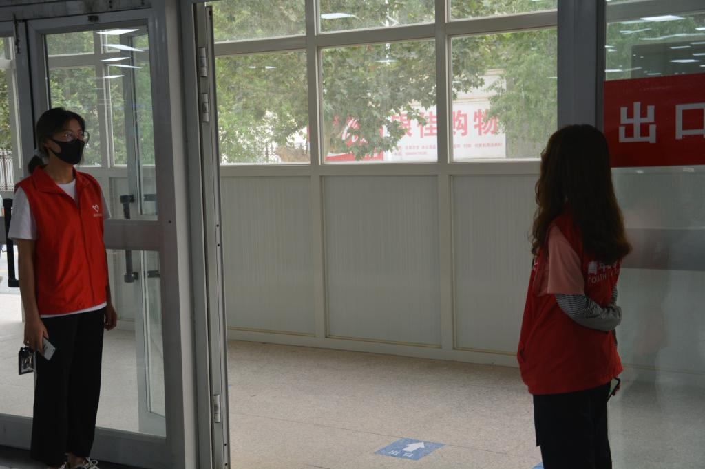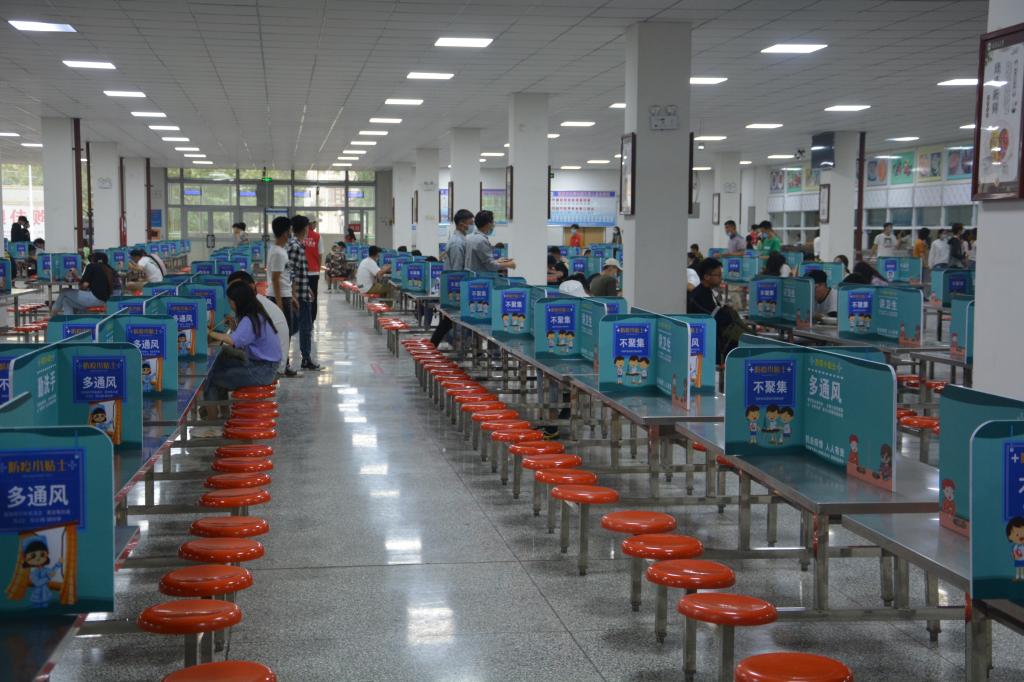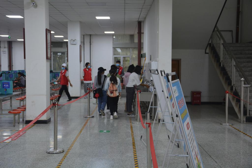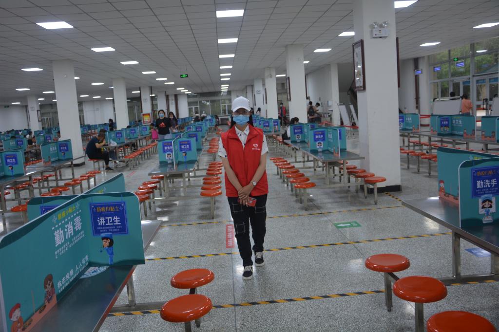 他们熟记志愿服务流程,为同学们提供便利。对刚到校园不熟悉就餐流程的学生提供指导,对进入食堂的每一个学生都亲切提示他们洗手后就餐,就餐时一人一个隔板,避免就餐时同向多人发生聚集。