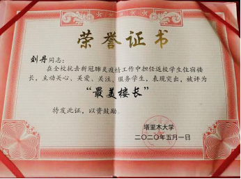 刘丹在担任楼长的时间里,始终承担着自己的责任,默默无闻的坚守着、奉献着,用汗水和青春践行初心使命,诠释了胡杨精神。(文/张杏)