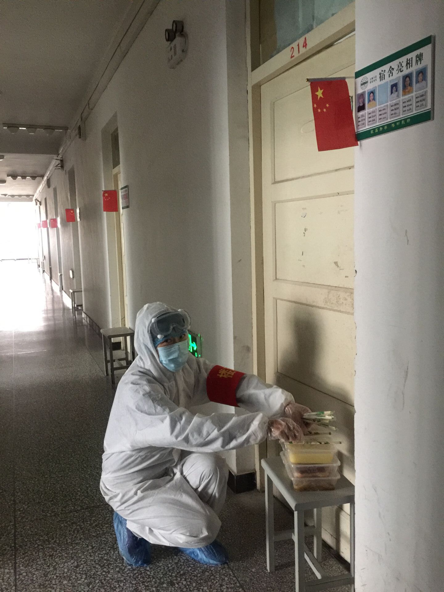 王老师带着一脸的疲惫和黑眼圈,早早就起了床。下楼清点好早饭的数量,然后提到4楼,一个宿舍一个宿舍地给同学们派饭,晚饭后又挨个收垃圾、发消毒片,叮嘱学生注意保暖,取快递送到宿舍,领取物资发给学生……