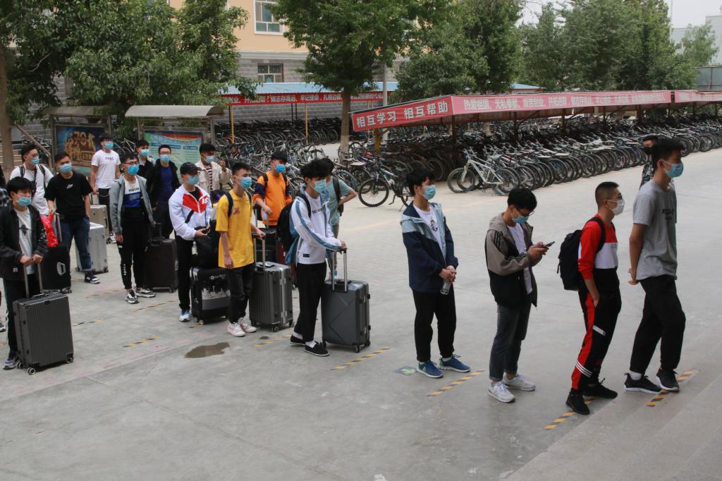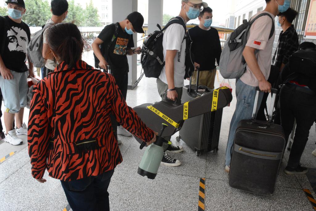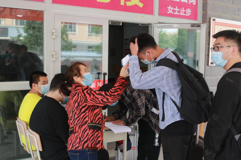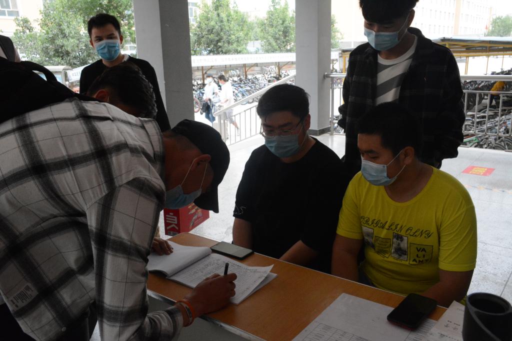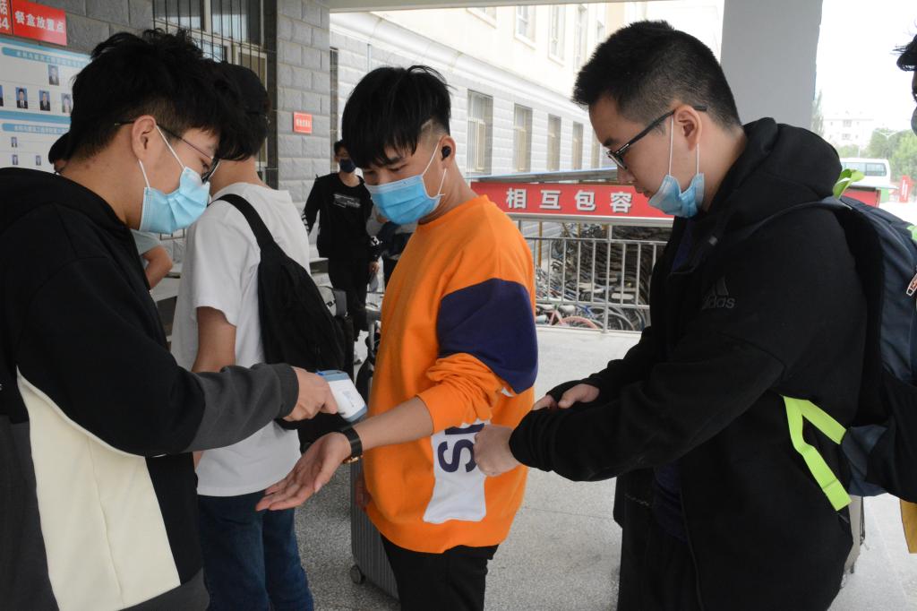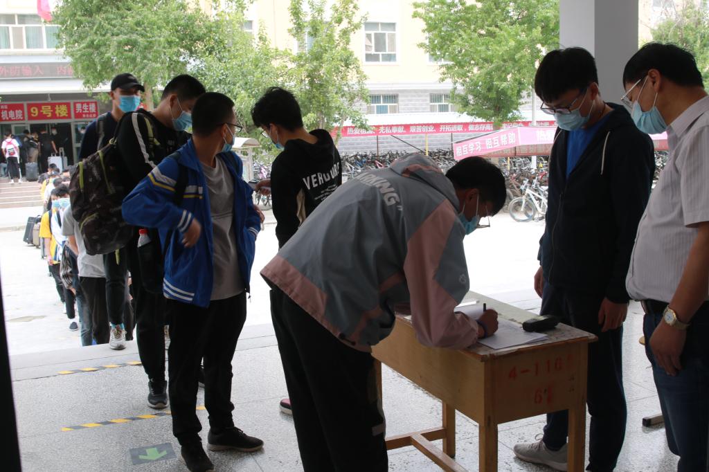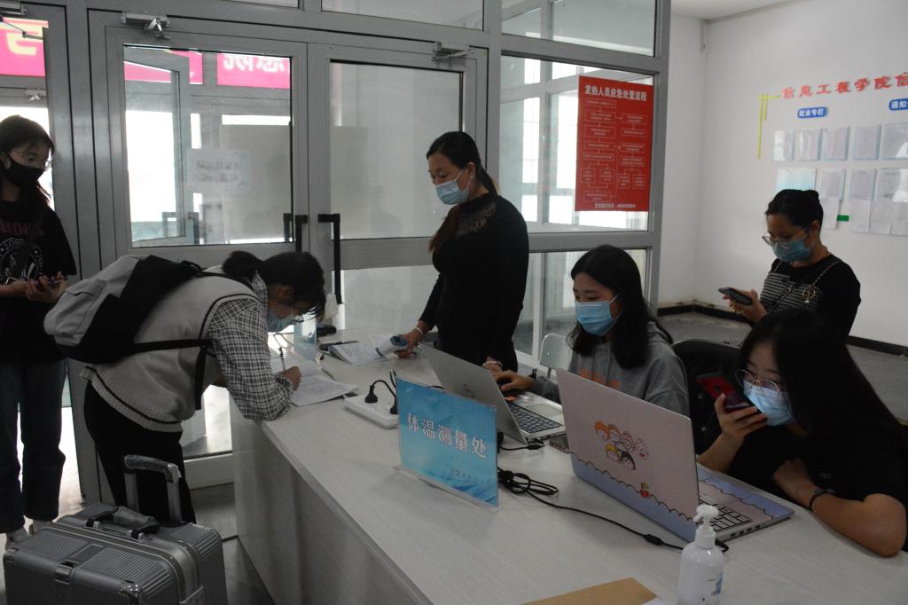 同学们自觉按照学校要求,自觉排队登记信息、测量体温、消杀毒、办理入住手续办理。