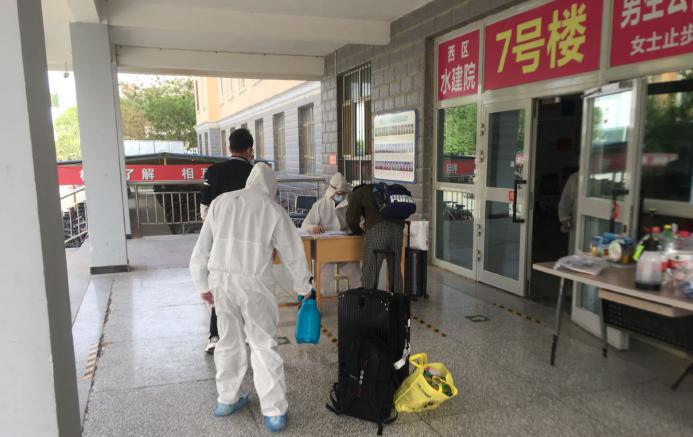 宿管科工作人员进行值班、消杀,在宿舍门口设有体温登记点和返校学生登记处,每个学生入楼前,工作人员分别对其进行严格体温检测和行李消毒,保障每一个学生安全入住宿舍。全天24小时,宿管科值班员积极配合楼层长,为学生做好各项服务。