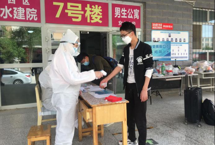 学生返校前,为了保障返校复学工作有序进行,宿舍值班人员和保洁人员日以继夜的忙着准备着,在做好个人防护的同时,做好值班登记和测温,确保学生健康安全入住宿舍。