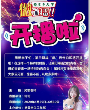 4月29日16:30分,学工部通过钉钉直播举办网络思政战“疫”云告白系列线上直播活动。党委副书记张爱萍应邀做客直播间与同学们分享战“疫”里的中国和对胡杨学子的殷切希望,人文学院辅导员吴垠担任主播。直播时长1小时28分钟,吸引了11934名学生围观,点赞量达到571440次。