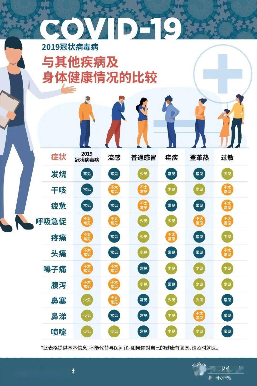 最后,如果觉得身体不舒服,担心被新型冠状病毒感染但又不确定。可以参考下面这个表格查看2019冠状病毒病和其他常见疾患的症状。当然,一张表格不能起到诊断作用,如果对自己的健康有顾虑,还需及时就医。